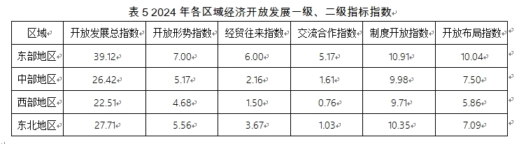 表5陈列了全国各区域2024年经济成长指数环境。2024年,东部区域的成长指数最高,达到了39。12,其次是东北地域的27。71,再次是中部地域的26。42,最低是西部地域的22。51。总体上看,各区域成长指数取其经济成长情况和地舆慎密相关。对于东部地域来说,因为其经济较为发财和接近沿海,因而也具备对外对内双向的前提从而成长指数较高,但对于西部地域来说,因为其经济根本较为亏弱,并且为了经济成长可能会通过行政解除、构成分歧程度的处所和市场朋分,从而晦气于对外对内双向,因而其成长指数得分较低。雷同的环境也同样反映正在各区域的二级目标傍边,东部地域正在形势、经贸往来、交换合做、轨制和开辟结构方面均处于首位,而西部地域正在各二级目标中的得分均为最低。