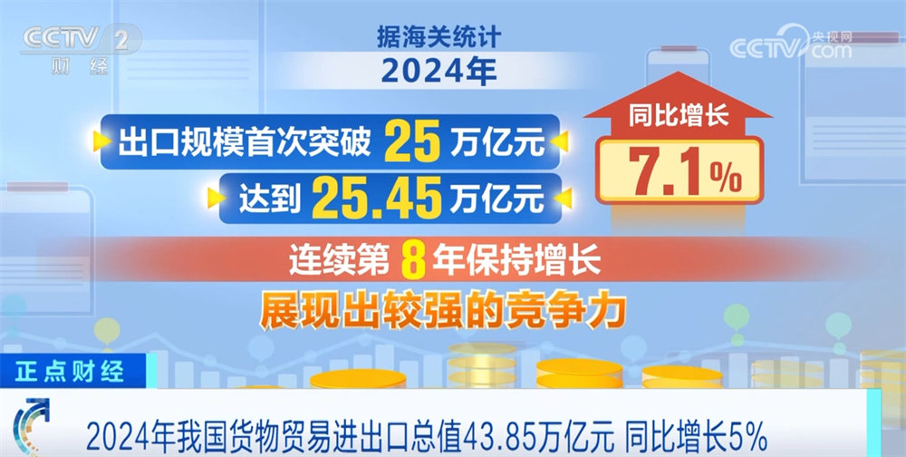 据海关统计,2024年,我国货色商业进出口总值43。85万亿元,同比增加5%。此中,出口规模初次冲破25万亿元,达到25。45万亿元,同比增加7。1%,持续第8年连结增加,展示出较强的合作力。进口18。39万亿元,增加2。3%。