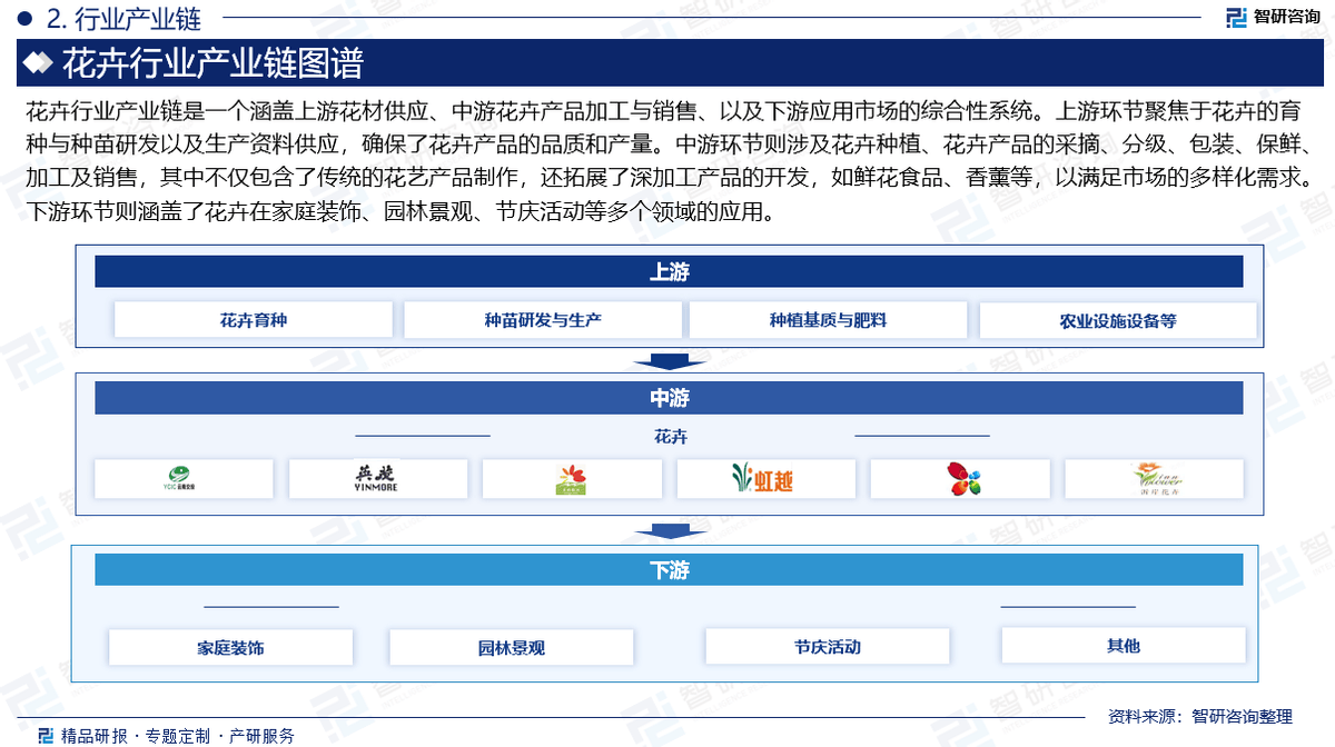 花草行业财产链是一个涵盖上逛花材供应、中逛花草产物加工取发卖、以及下逛使用市场的分析性系统。上逛环节聚焦于花草的育种取种苗研发以及出产材料供应,确保了花草产物的质量和产量。中逛环节则涉及花草种植、花草产物的采摘、分级、包拆、保鲜、加工及发卖,此中不只包含了保守的花艺产物制做,还拓展了深加工产物的开辟,如鲜花食物、喷鼻薰等,以满脚市场的多样化需求。下逛环节则涵盖了花草正在家庭粉饰、园林景不雅!