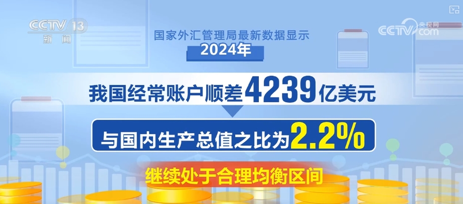 国度外汇办理局最新数据显示,我国经常账户顺差4239亿美元,取国内出产总值之比为2。2%,继续处于合理平衡区间。外商间接投资本钱金新增909亿美元,来华债券投资净流入468亿美元。2024岁暮,我国对外净资产为3。3万亿美元,增加15。6%。