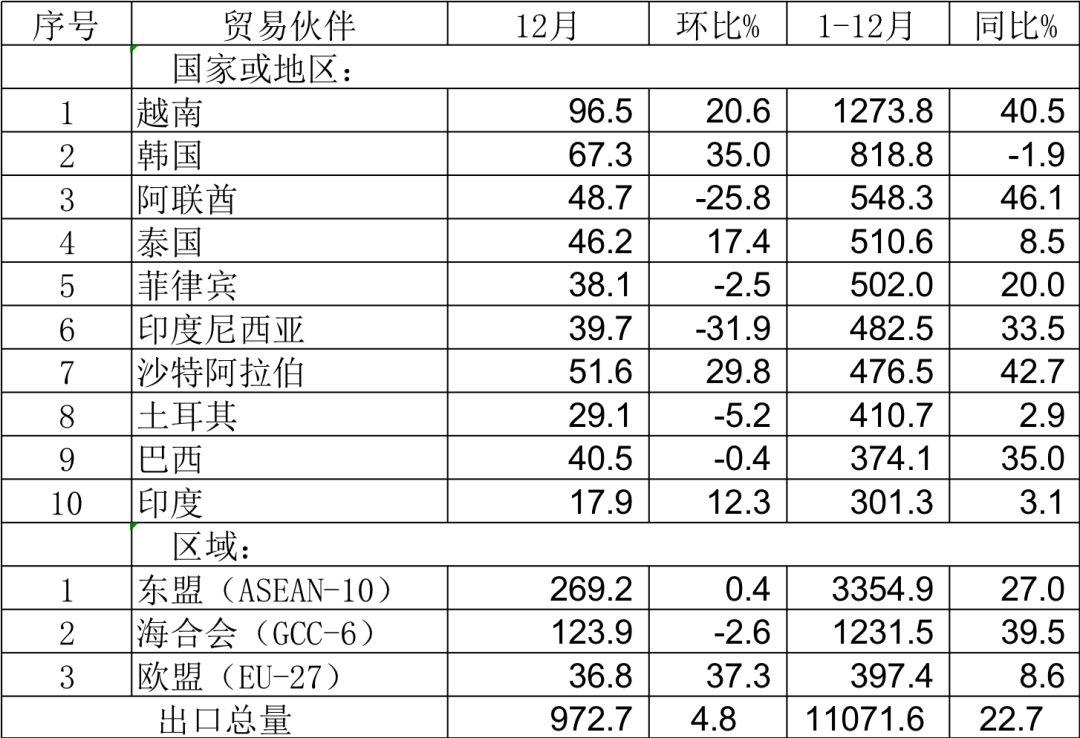 12月,我国钢材出口的次要区域仍集中正在以韩国、东盟以及海合会国度为代表的亚洲地域,对大都国度出口环比呈现下降。